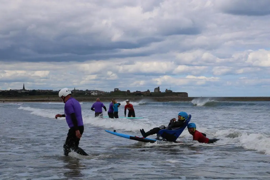 Swipe through this image gallery of South Shields Surf delivering an adapted surfing session in July 2023 with their tandem seated surfboard, designed to accommodate individuals with diverse disabilities.