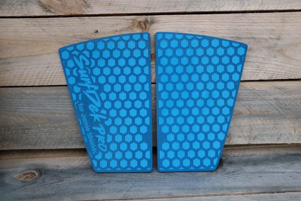 Traction pads are fairly self-explanatory. They sit near the tail of your surfboard and help you figure out where your foot placement is at all times while riding the wave. Most standard traction pads are made out of Thermoformed EVA, but differ in textures, shapes, colours, arch contours and kick profiles. SurfDek traction pads are made from a new brushed foam formula, meaning no diamonds or pyramids are necessarily needed. This creates an even better board feel whilst still maximising grip. Traction pads and surfboard wax are used on almost all shortboards, and are chosen almost entirely based off of personal preference and what feels comfortable to the rider.